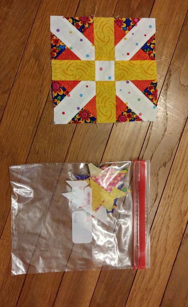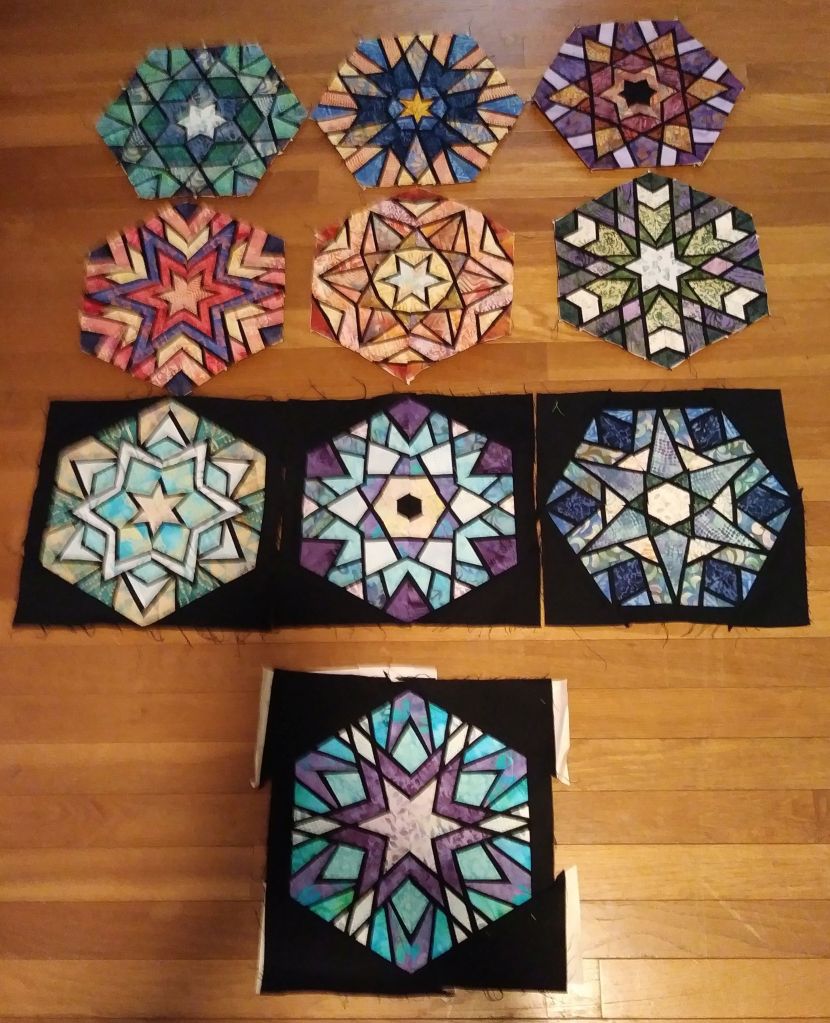 These black and batik stars have been kicking around for a few years (OK since Ula Lenz started releasing them as a BOM in 2016). I got one block center finished last quarter. What else is needed to move it into the finish column? Choose fabrics for the remaining two blocks, put black on 8 blocks, trim that one oversized block, set all the blocks into a top, quilt, label and bind it. Piece of cake! The project looks like this today: