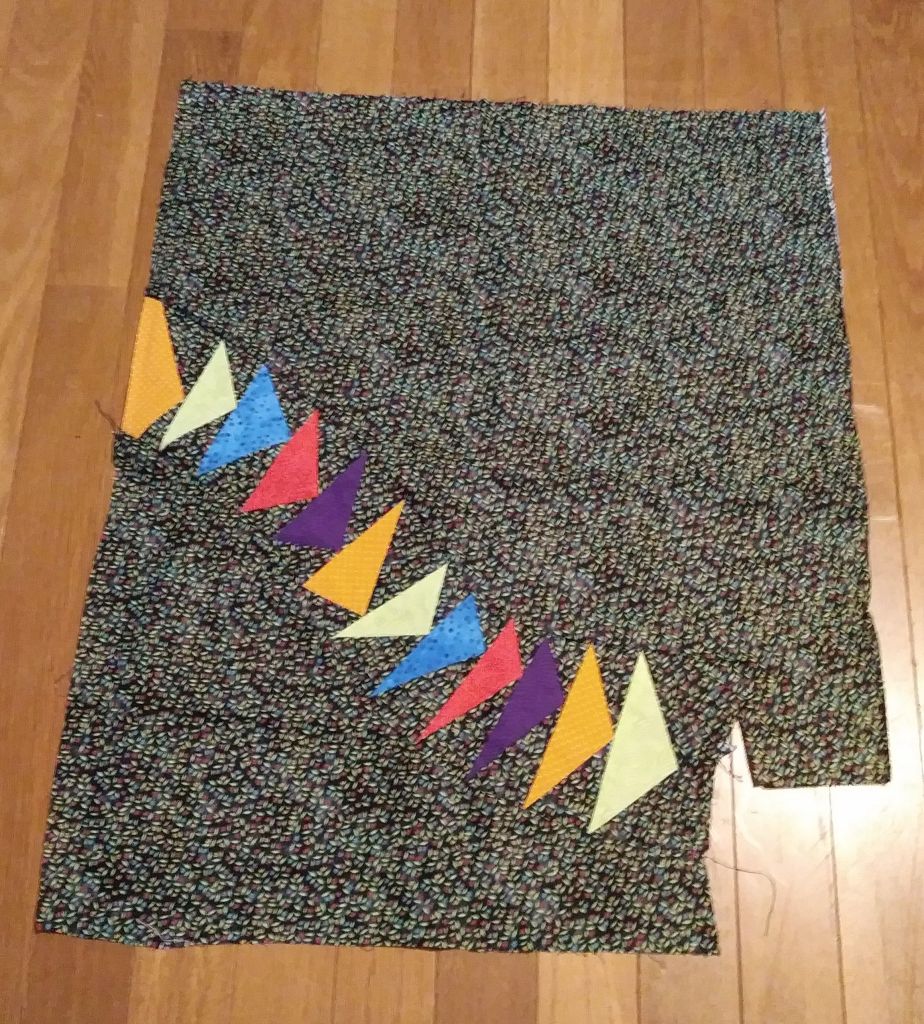 And, my first new project for this quarter is not really new. It is new to this list and it is a surprise gift so please do not mention it outside of this blog. Years ago, when I was caught in the throes of Stack and Whack fever, I cut the floral fabric into triangles. And I bought the purple fabric, along with some backing fabric. Recently I purchased some hot pink for an accent fabric and cut some purple triangles. Here is my project so far, spread out on a pink background: